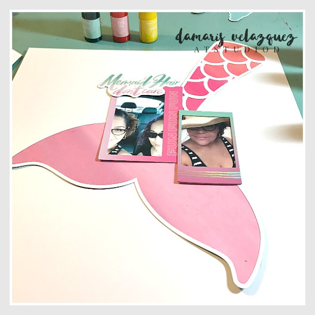 Next, it was just a matter of getting the color mists to spray on the cardstock where I wanted it to, add pattern paper behind my mermaid tail, frame my photos and embellish. I'm so thrilled and relieved that it came out how I envisioned. And I hope it inspires you to dust off your diecutting machine and get to creating something unique and fun.Just use your imagination!